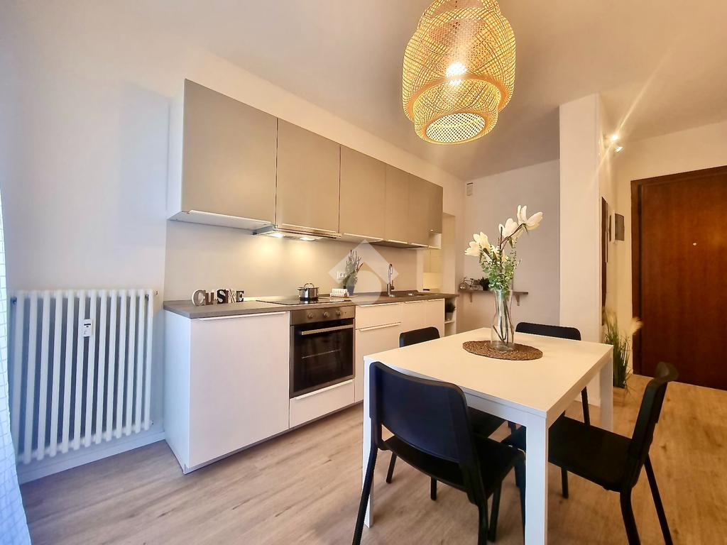 L’ingresso conduce al soggiorno con angolo cottura, completo di ogni comfort e con accesso diretto al terrazzo.