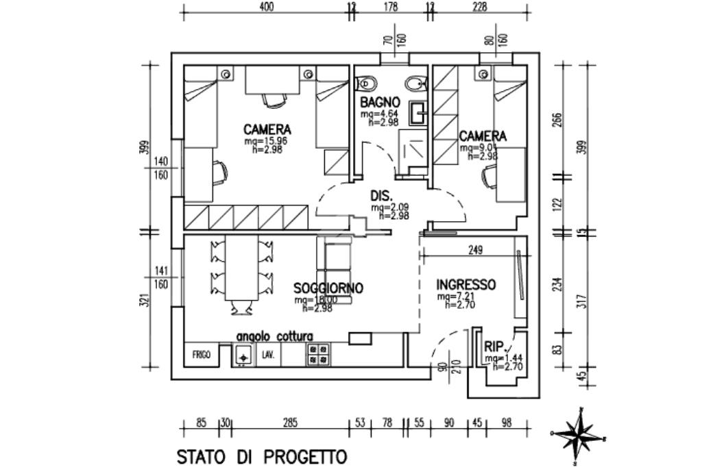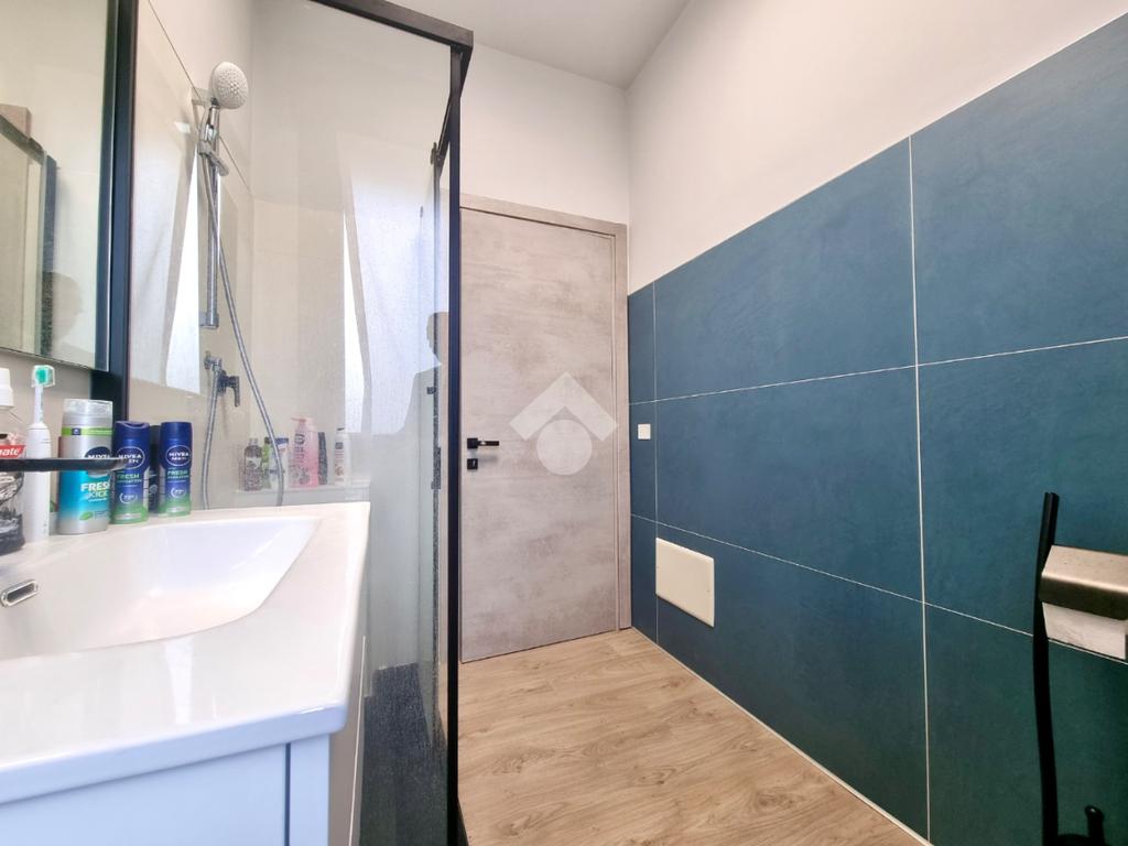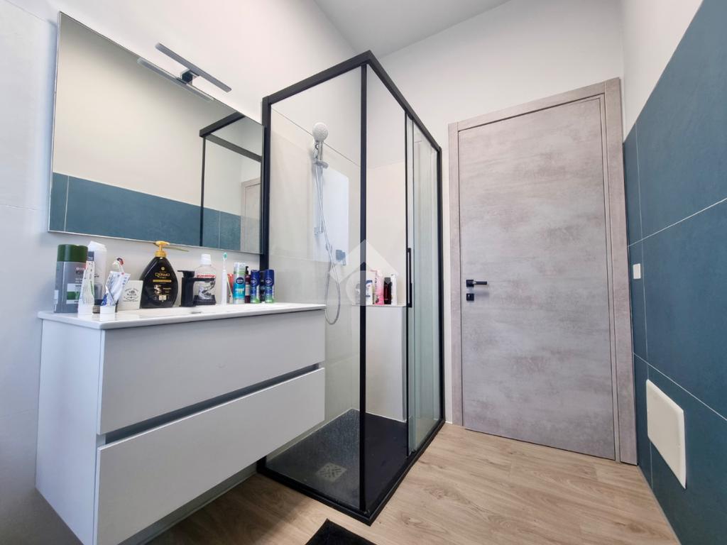 La soluzione si compone di un soggiorno con cucina a vista, servita da un pratico ripostiglio, e da un bagno finestrato con doccia.