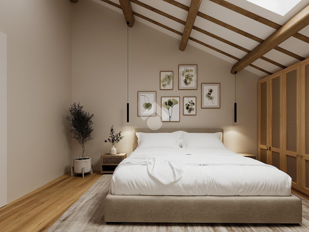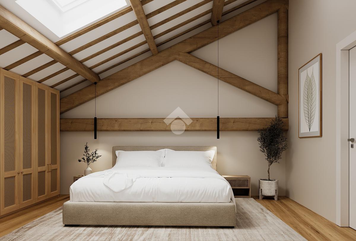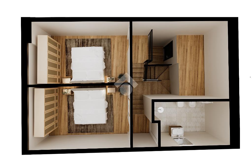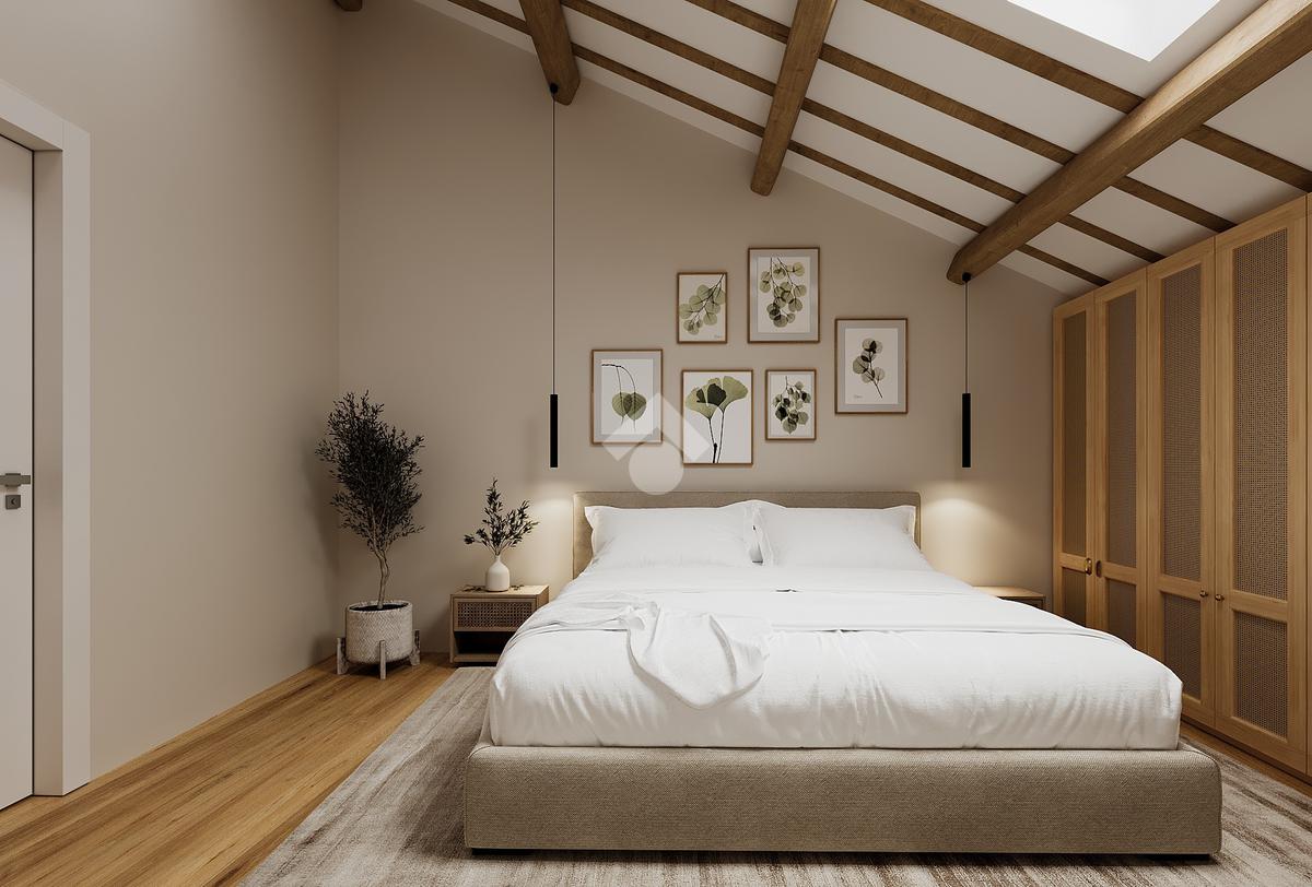 L’abitazione, dotata di riscaldamento autonomo e doppi servizi, si apre su una luminosa zona living con cucina a vista, servita da un primo bagno con doccia. Una scala interna conduce al piano superiore, dedicato alla zona notte, caratterizzato da suggestive travi a vista, dove trovano spazio due camere matrimoniali e un secondo bagno finestrato.