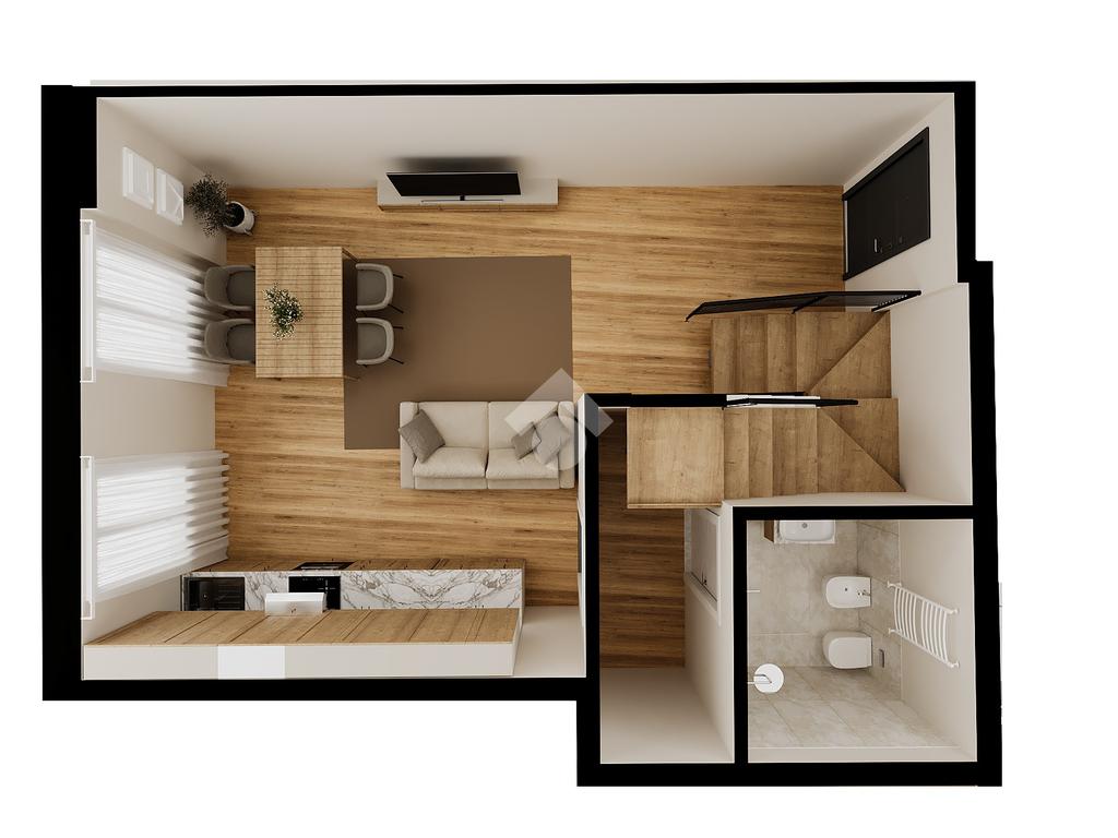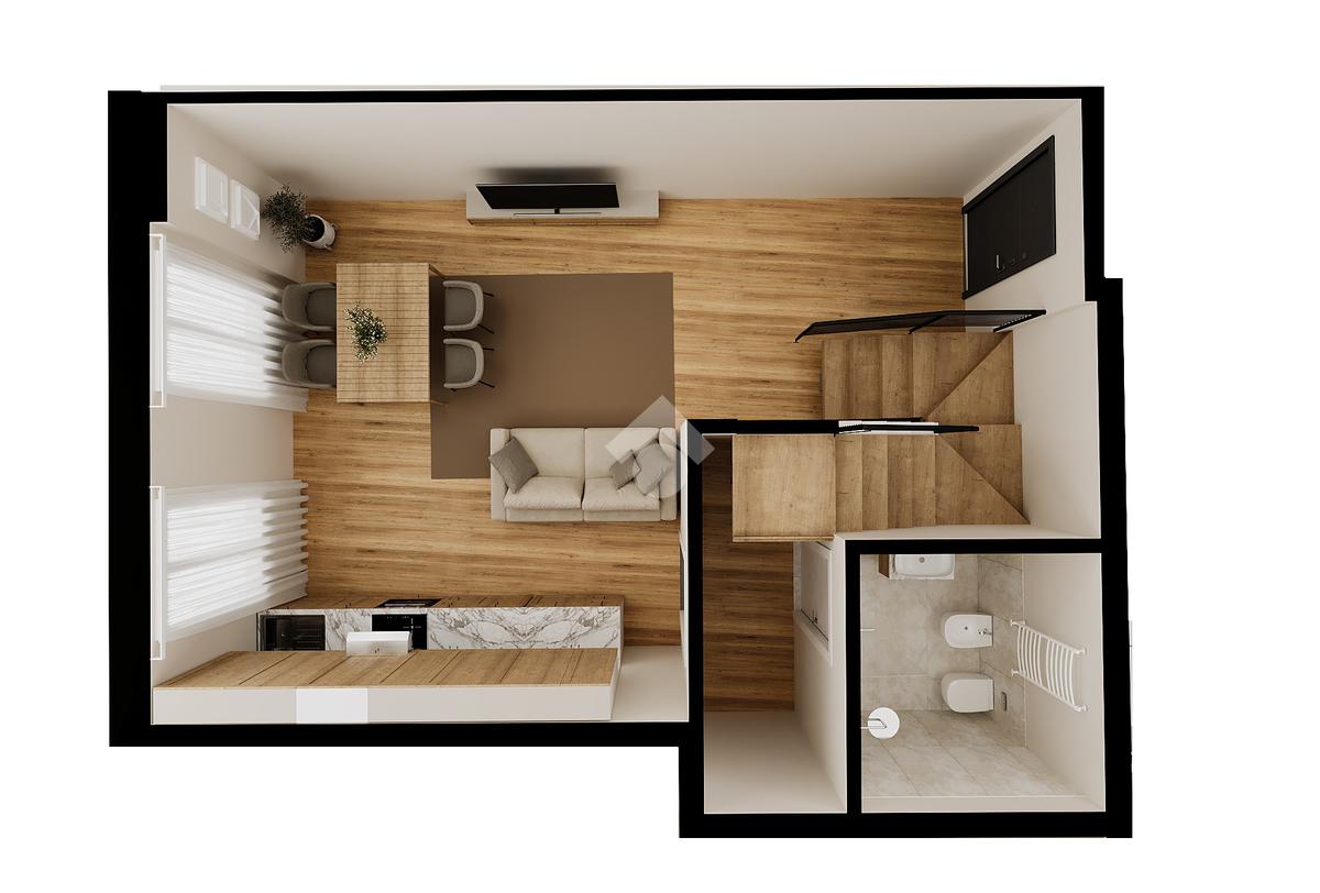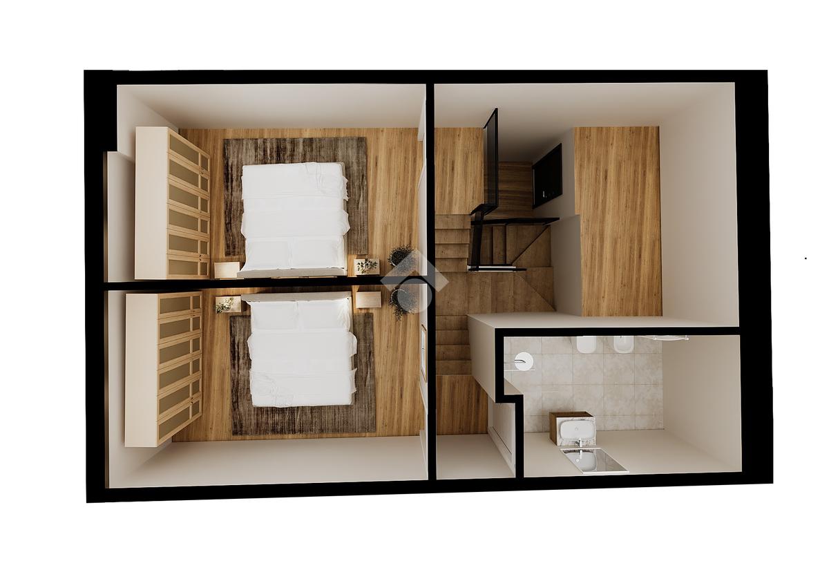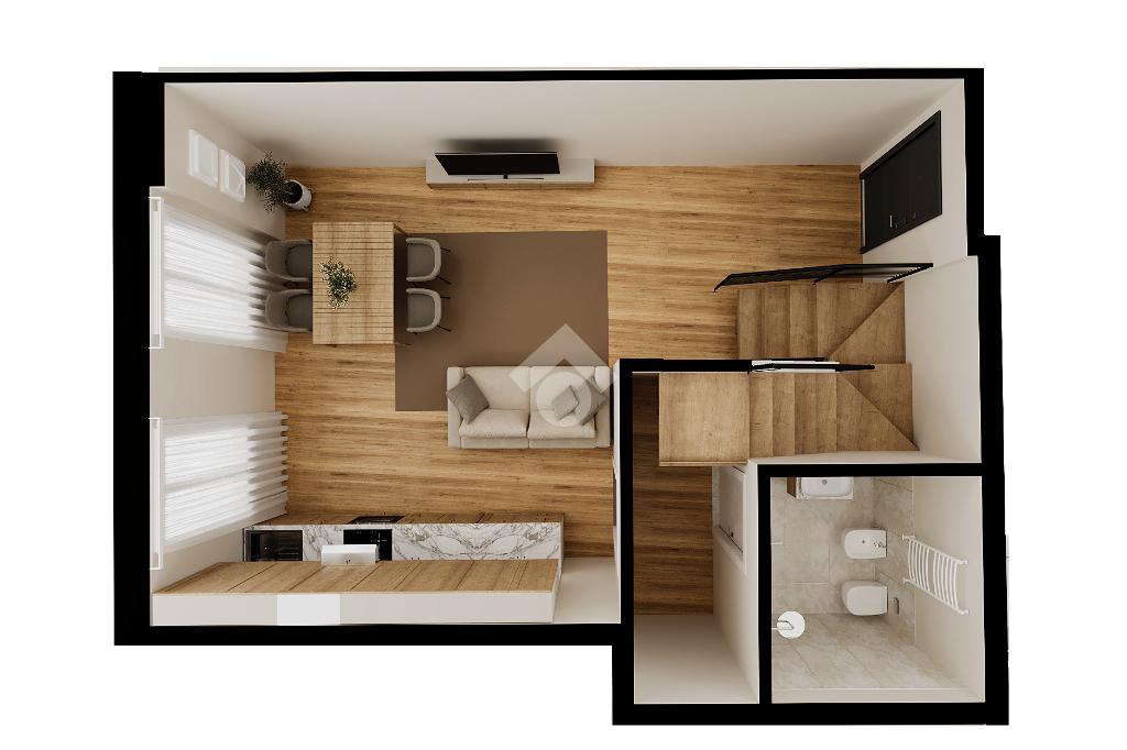 L’abitazione, dotata di riscaldamento autonomo e doppi servizi, si apre su una luminosa zona living con cucina a vista, servita da un primo bagno con doccia. Una scala interna conduce al piano superiore, dedicato alla zona notte, caratterizzato da suggestive travi a vista, dove trovano spazio due camere matrimoniali e un secondo bagno finestrato.